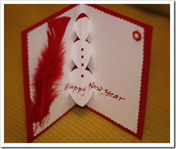 После того, как главный элемент открытки готов и приклеен на свое место, следует вырезать квадратные окошки с внешней стороны, так, чтобы они размещались ровно над приклеенными элементами. С внешней стороны написать слова поздравления, пожеланий и тому подобное, а квадратные окошки скрепить атласной лентой.